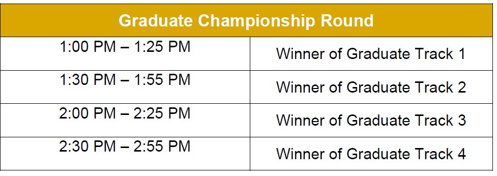 At 1:00 PM we will kick off the Graduate Championship Round from 1:00 PM - 2:55 PM.